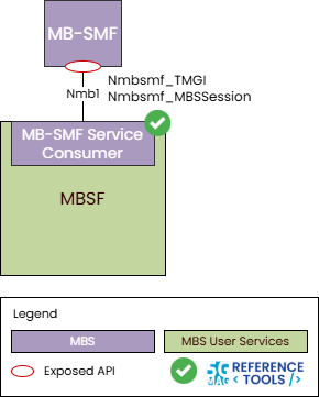 Nmbsmf_TMGIservice API is used at reference pointNmb1for the allocation and deallocation ofTMGIs, and theNmbsmf_MBSSessionservice API is used to reference pointNmb1for the creation, modification and destruction of MBS Sessions and for the management of notification subscriptions to events arising on those MBS Sessions. - The