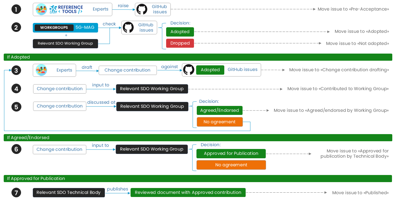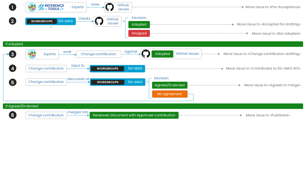 To report a bug, request a new feature or express a doubt, please create a new issue with a corresponding template. Issues will be regularly reviewed by 5G-MAG according to the following workflows.