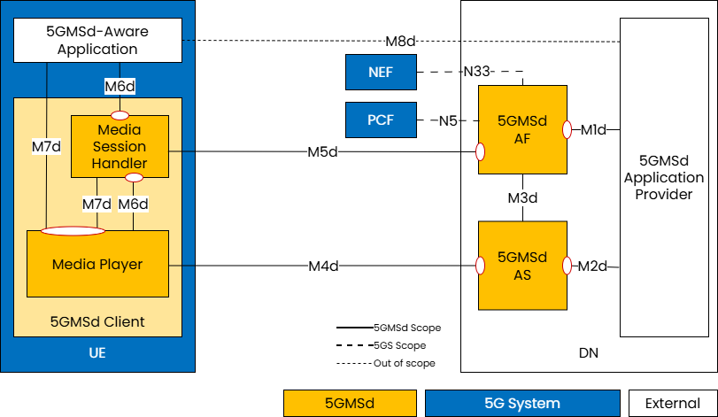 | M5d | Media Session Handling API | Control-plane APIs between the 5GMSd AF and Media Session Handler for session control, QoE reporting, and security (auth/auth). |