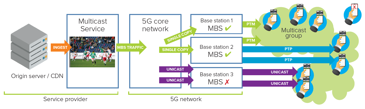 3GPP Release 17 brings Multicast–Broadcast Services (MBS) to the 5G System, based on 5G Core and New Radio. MBS allows the network to select the most suitable among point-to-multipoint (PTM) or point-to-point (PTP) delivery based on requirements set by either service providers or network operators and/or taking into account concurrent user demand.