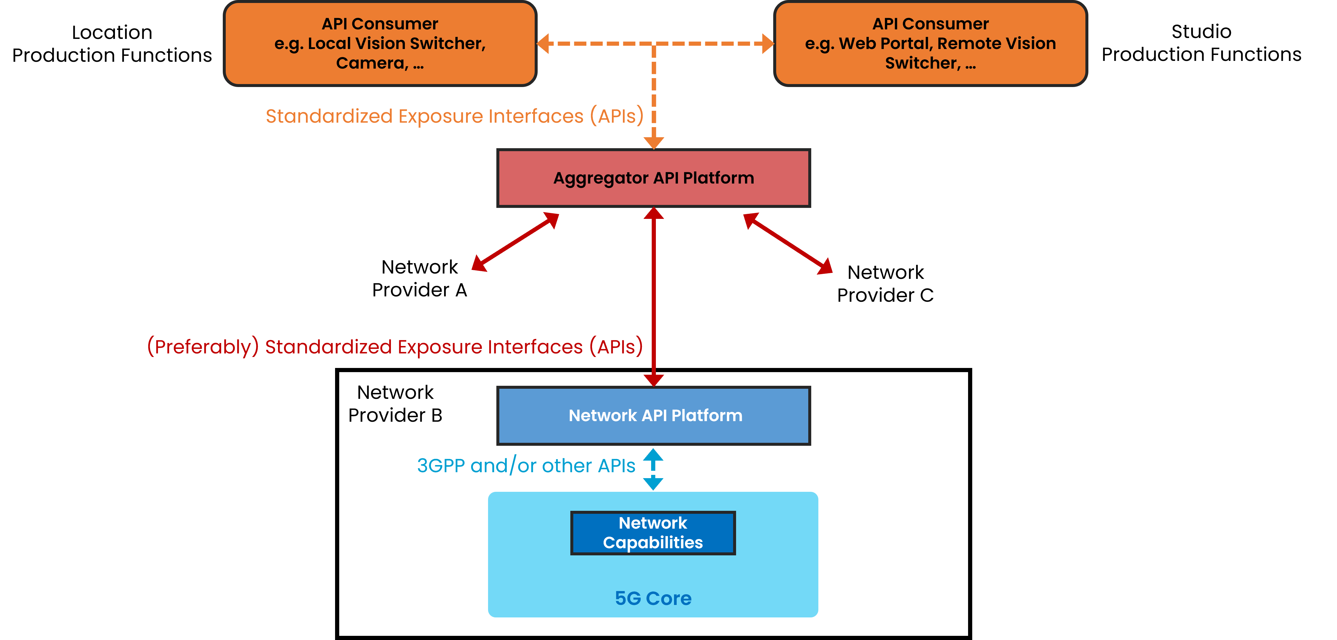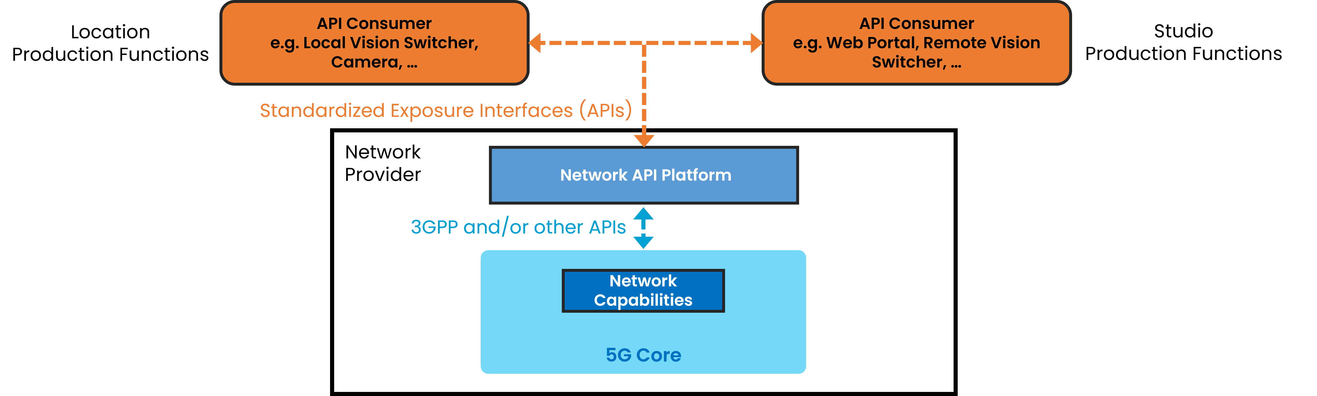 The Network API Platform of a Network Operator is accessed directly from API Consumers, either deployed with the Studio Production or the Location Production functions. The API consumer can be a Web Portal, e.g. offered by the CSP. Alternatively, the API consumers can be embedded production devices like a Vision Mixer or a production orchestration solution (NMOS concept). The API consumer functions can be integrated in media servers, responsible for receiving the video stream from the application client.