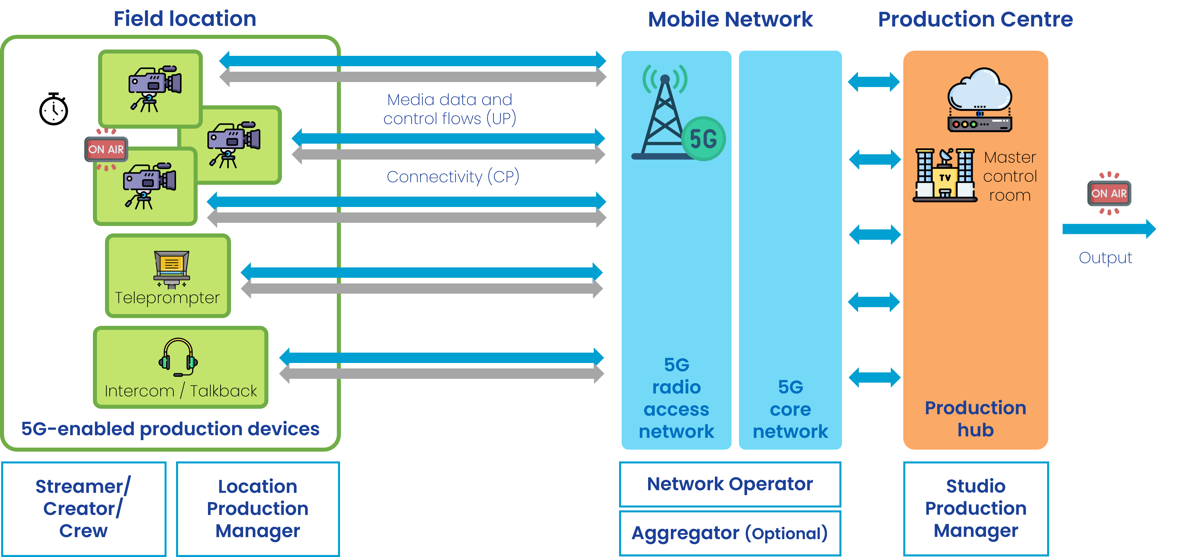 A production crew deployed in the field or at a venue is covering an event using multiple devices including cameras, audio equipment, intercom, etc. Multiple devices are concurrently used during the production. Not all data flows have the same priority and quality requirements. Therefore, each device and data flow should get the requested connectivity performance (e.g. throughput, latency, jitter,…) and with the desired QoS, which may change for each device and data flow during the production. Two options are considered when it comes to network deployment: